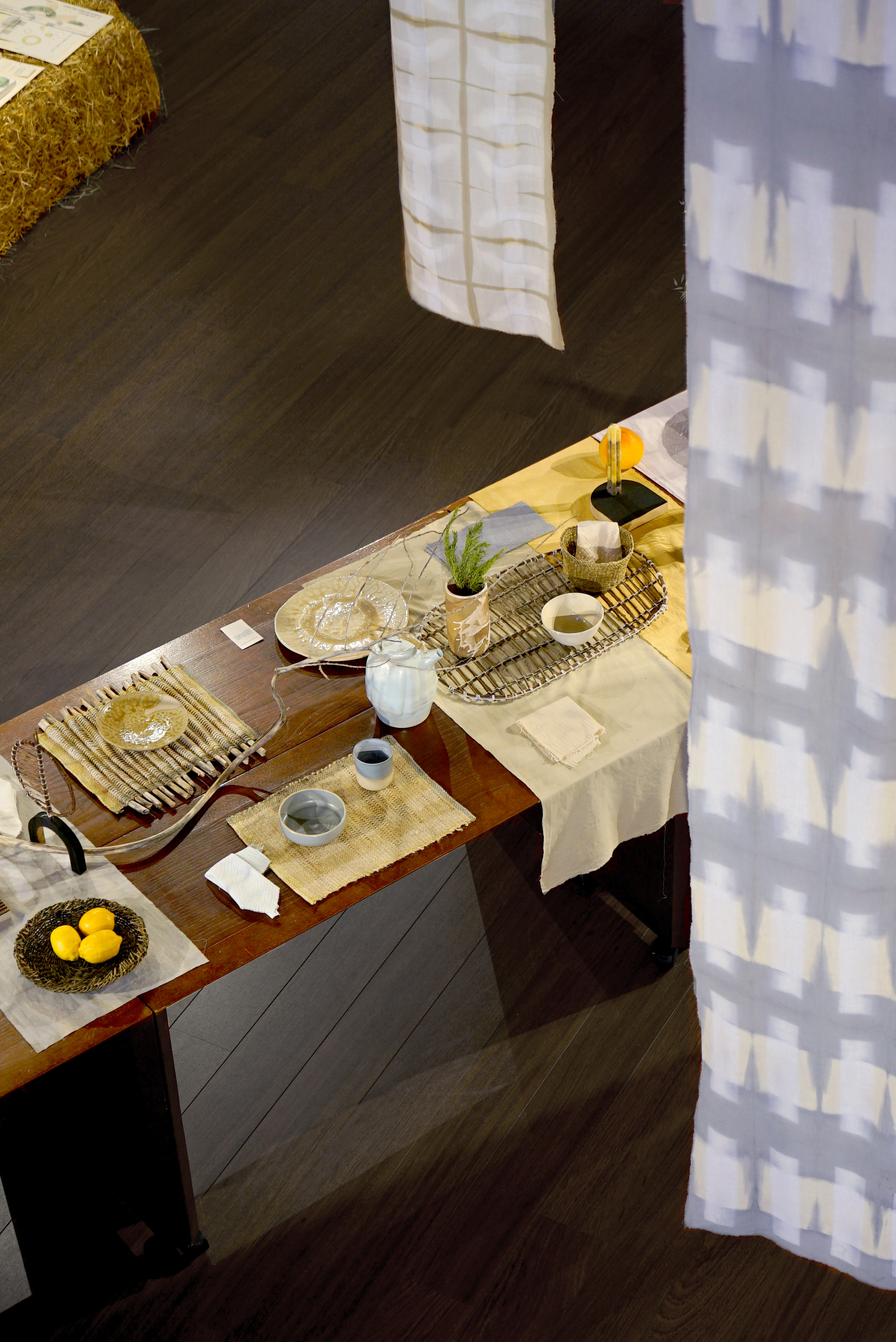 When questioning our ways of dwelling and what makes up our interior and exterior environments, the place of textiles appears to be central. Many aspects of our lives converge towards it: it comforts and protects us, dresses us and represents us. It can be considered as the first solution that humanity put in place to survive : weaving roofs, clothes or baskets even before making fire, cooking food or counting (see Gottfried Semper and Tim Ingold). Like an extension of the skin, textiles are an additional, and mobile, barrier to adapt to potentially hostile climatic events: as a thermal protection, shade or shelter from the rain for instance. Humans also adapt to the environment via textiles, as individuals or as a collective. Like a membrane that would mark the difference between interior and exterior spaces, like a skin would contain a body: a fabric that is stretched or laid down can mark the limits between a private piece of land, a home and a shared, public space. Closely linked to the question of language, weaving is also for me a tool for building meaning and participates in the writing of intimate and common history: the words text and textile are etymologically linked, in Latin for example, where the x of textus embodies the interweaving of fibers between the warp and the weft. Thus, by going to meet those who harvest fibers, those who shape them, braid them and weave them, we are telling a subtext generally relayed to the sphere of domestic work.
